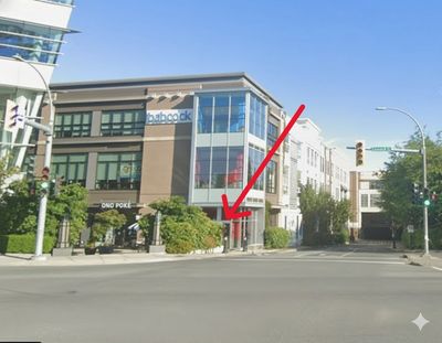 The ground level entrance is at the corner of Oak Street and Saanich Road and is marked with a red arrow in the picture.
